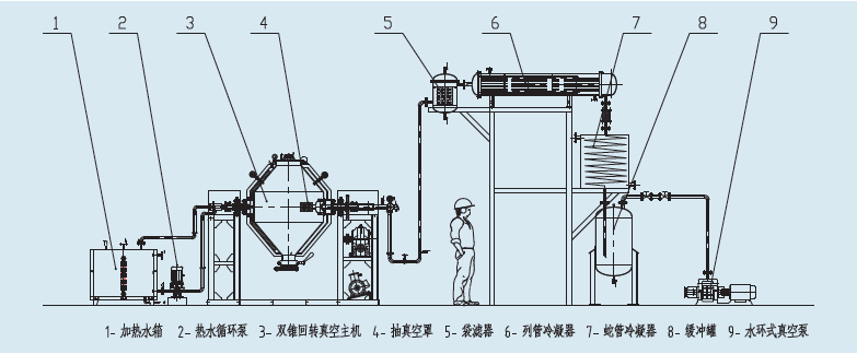双锥回转真空干燥机为双锥形回转罐体,设备中间为圆柱形,两端为圆锥形,圆锥顶部一头设计为敞开式投料(兼做人孔),另一端为蝶阀出料。罐体内、外共分三层,中间夹套加热介质可以是蒸汽、循环热水或导热油,保温层为中碱超细玻璃棉,耗能极少;内层投放物料。工作时罐内处在真空状态下,向夹套内通入导热油、热水或蒸汽等热媒进行加热,热量通过罐体内壁传递给湿物料。由于罐体内处于真空状态,各种物料中的溶媒(包括水)在真空的条件下均能在较低的温度迅速汽化,且罐体的回转使物料不断地上下、内外翻动,物料不断地更新与器壁接触的表面,从而充分利用了器壁所传导的热量,加快了物料的干燥速度,提高干燥效率,并能达到均匀干燥的目的。湿物料吸热后蒸发的溶媒(水汽),通过真空泵经真空抽气管被抽出。中途通过低温冷凝系统(采用自来水或冷冻盐水)进行冷却,以达到回收的目的,节约了生产成本,并改善真空泵的工作条件,还减少了对环境的污染。